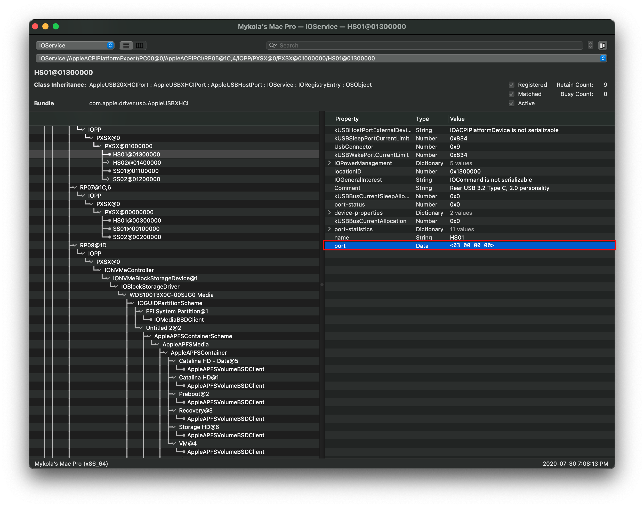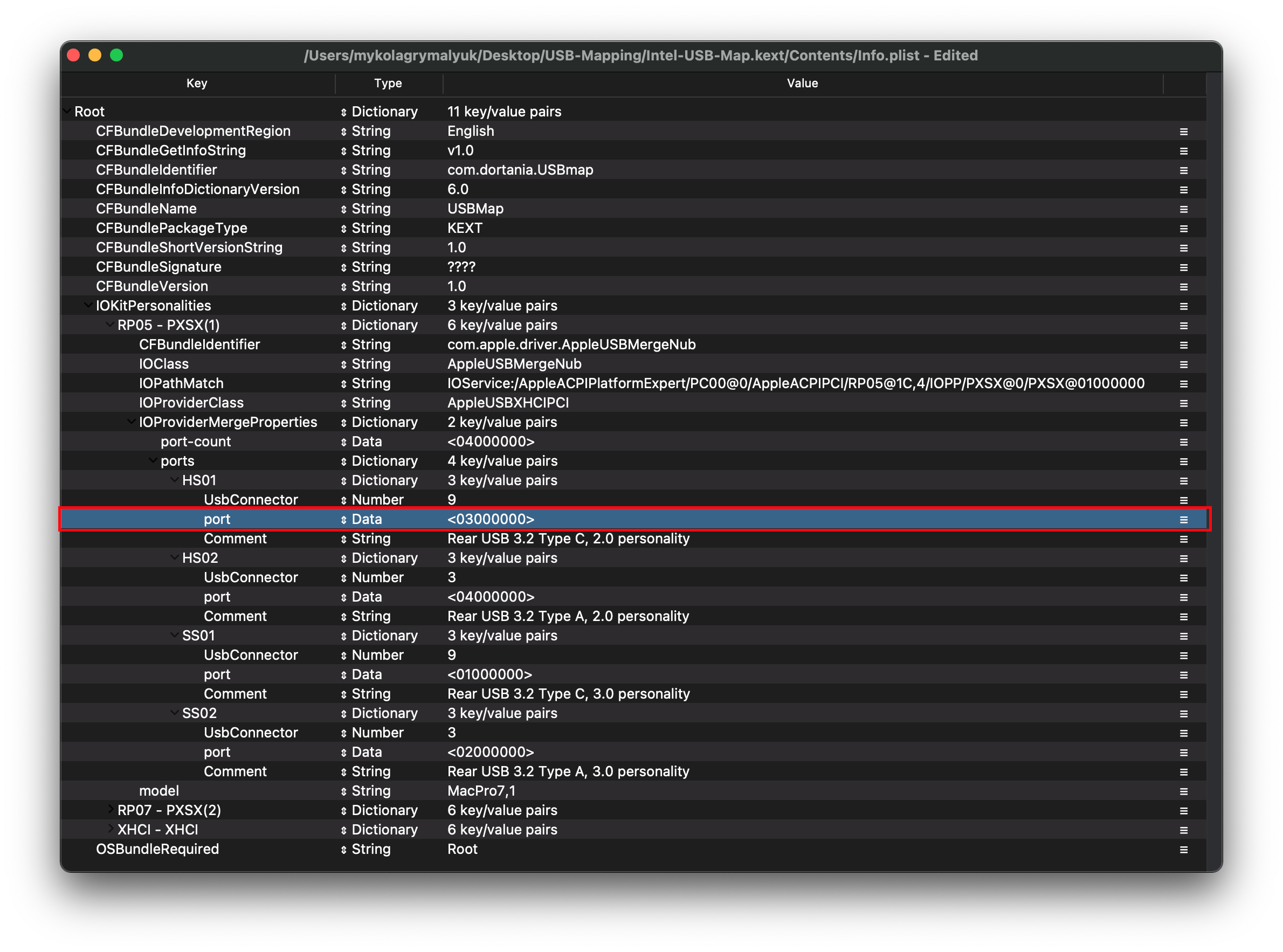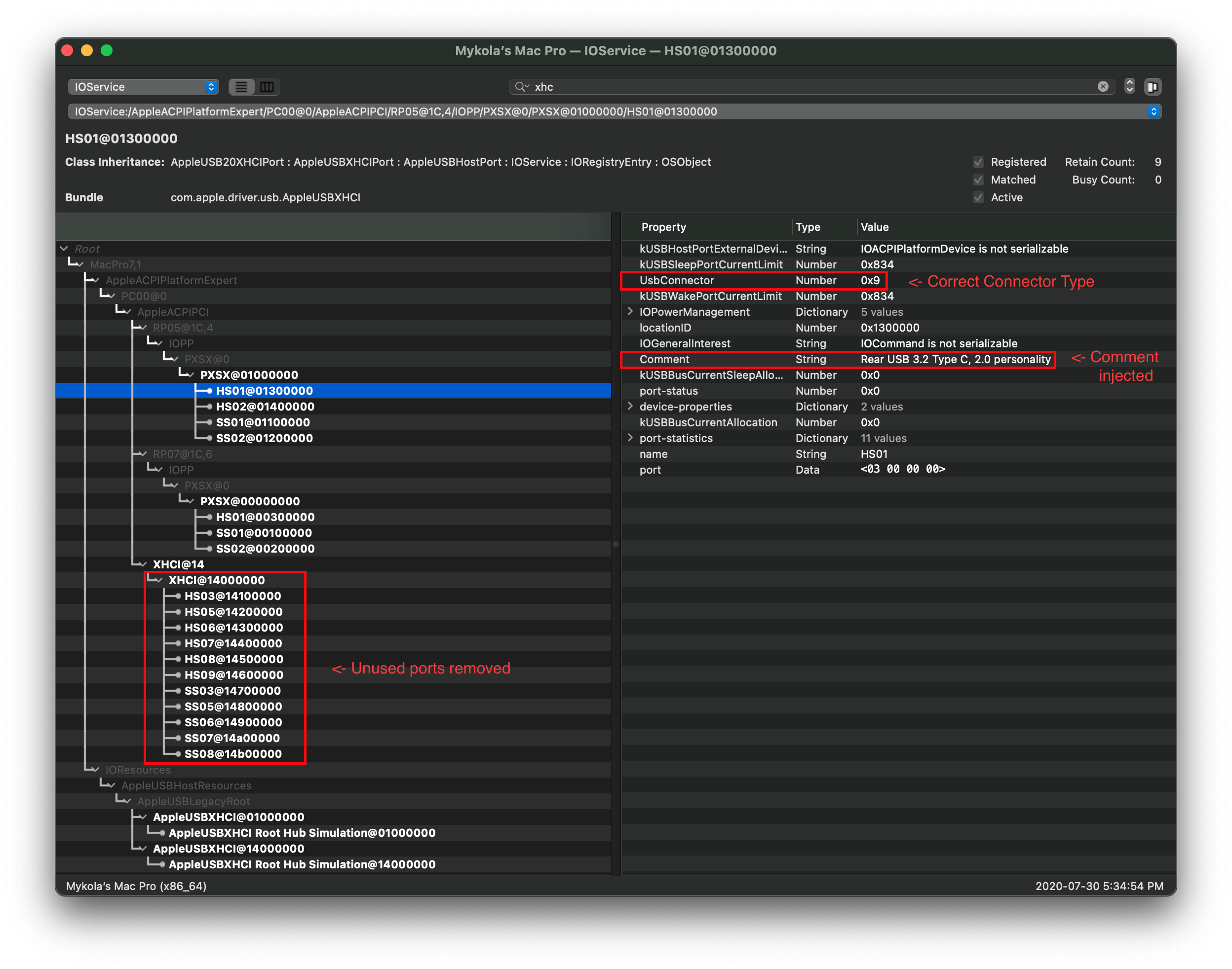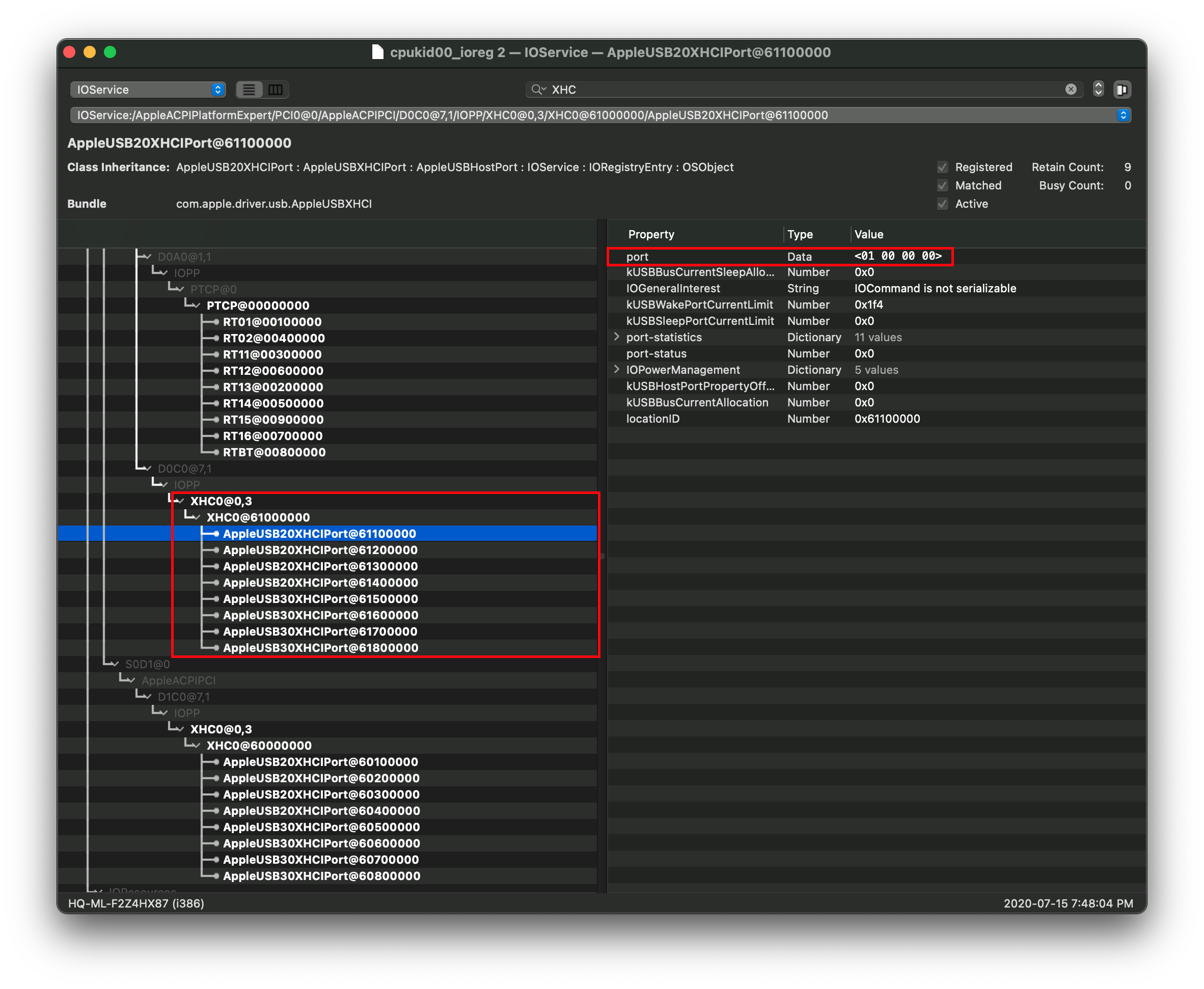 Lưu ý: Nếu cổng USB của bạn hiện lên là AppleUSB20XHCIPort hoặc AppleUSB30XHCIPort, bạn vẫn có thể map nhưng sẽ khó hơn chút. Thay vì ghi lại tên, hãy chú ý thật kỹ vào thuộc tính port ở phía bên phải: