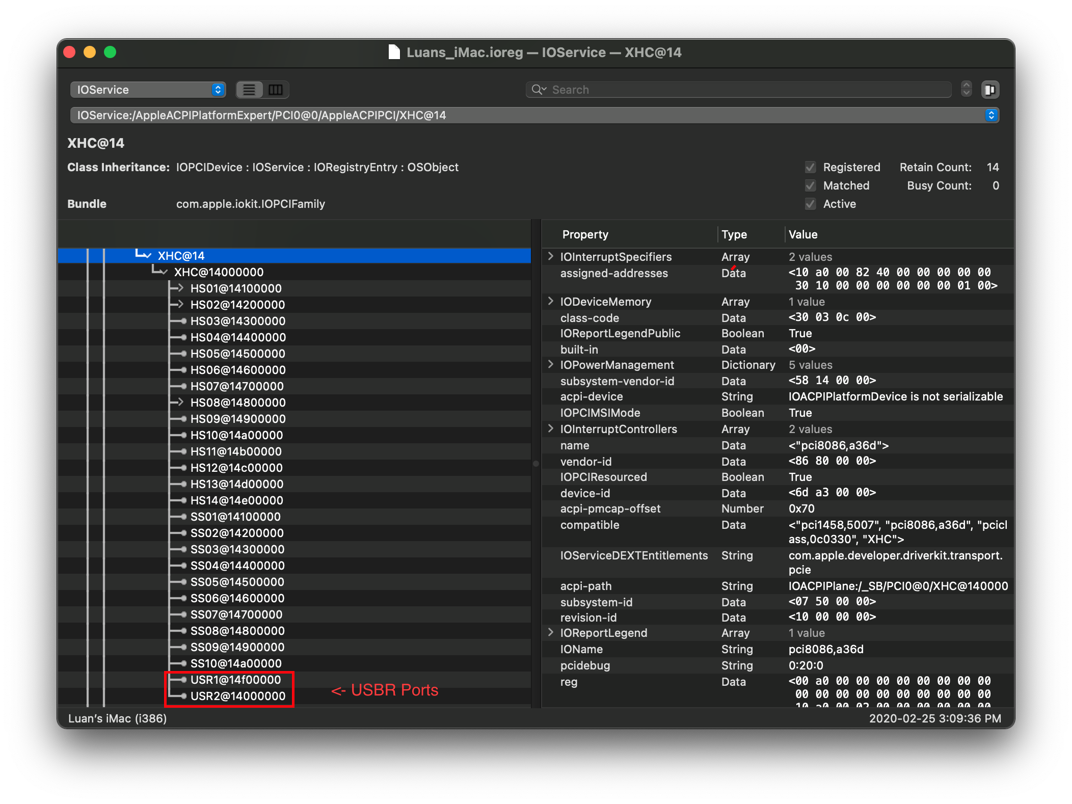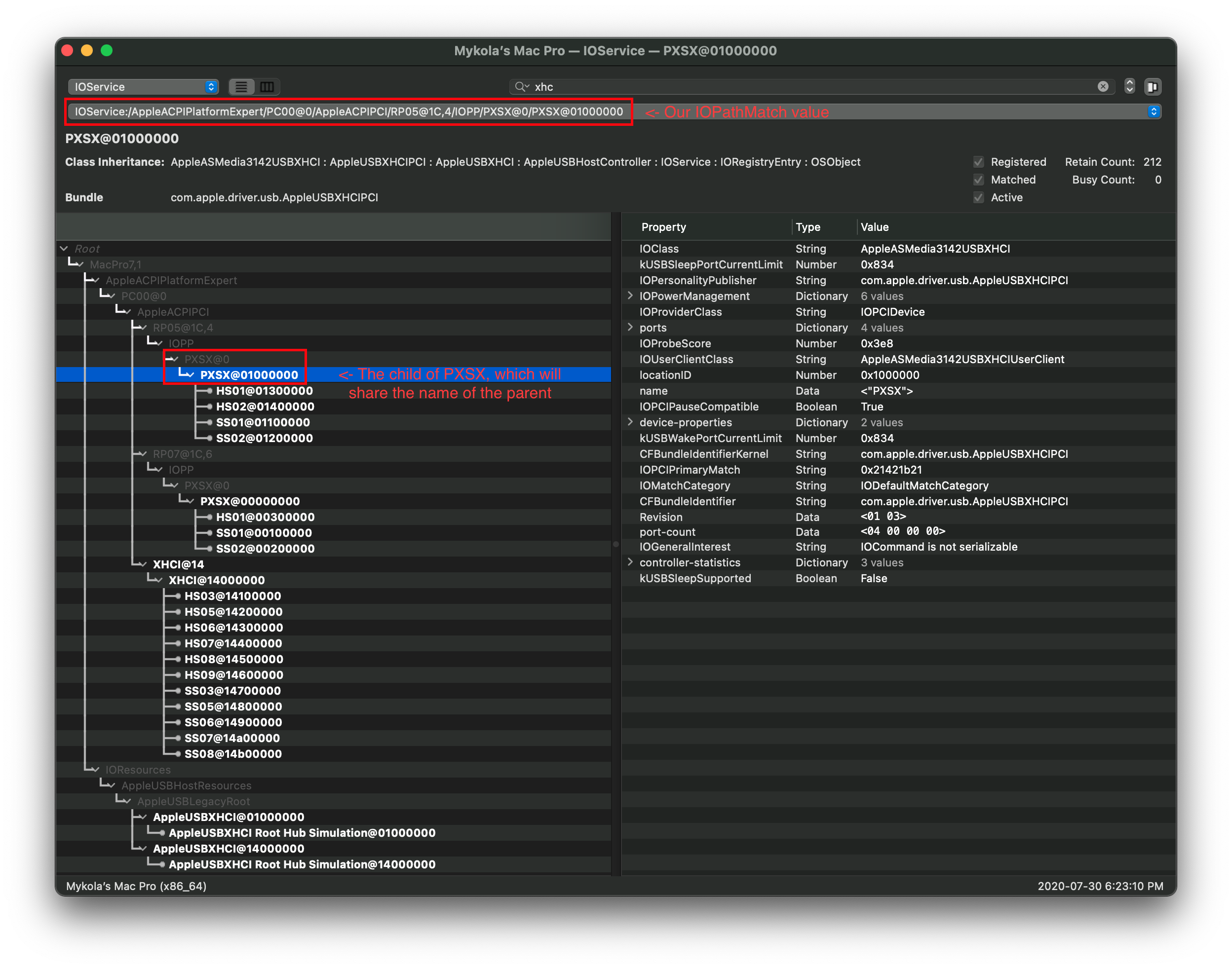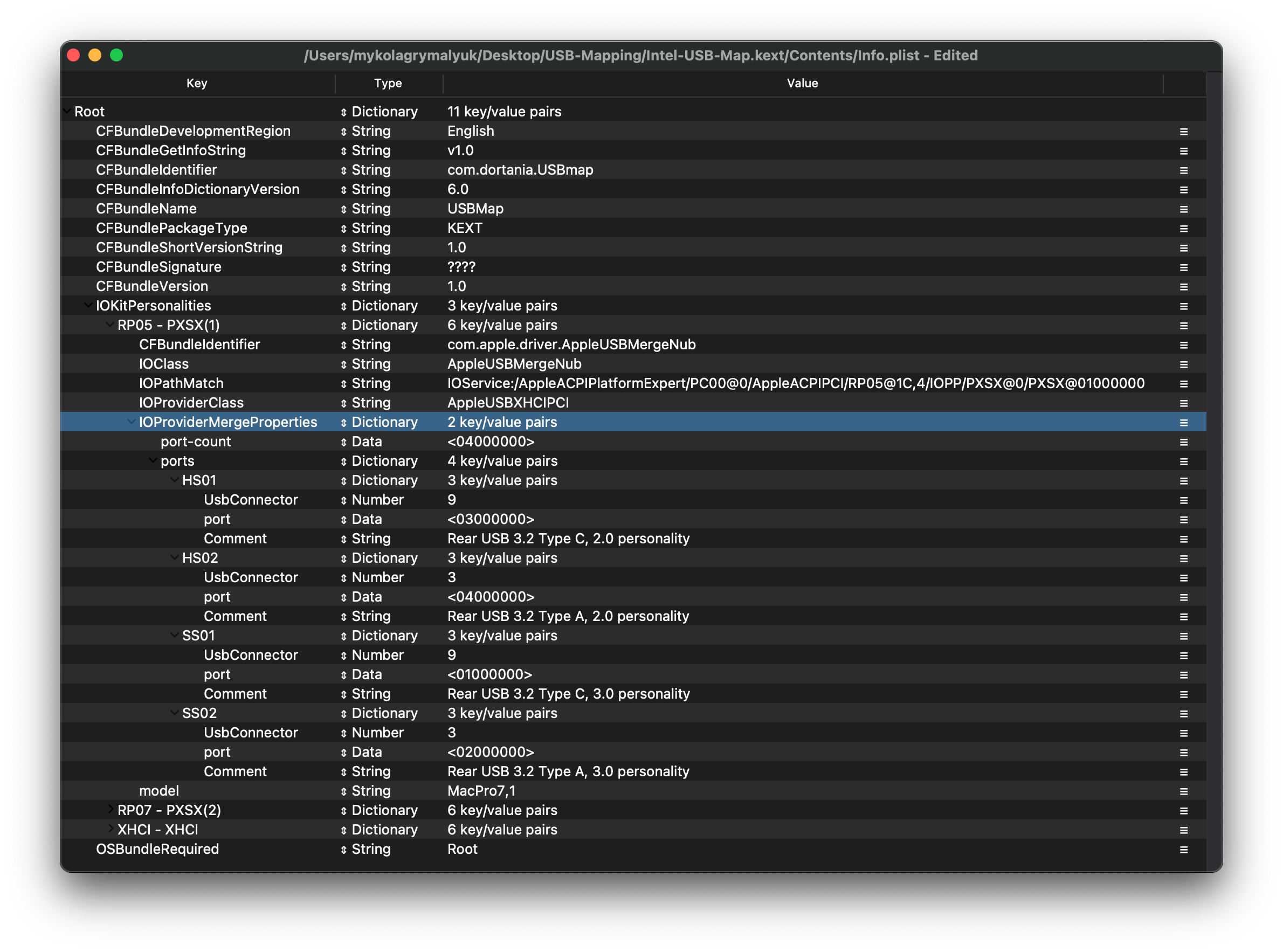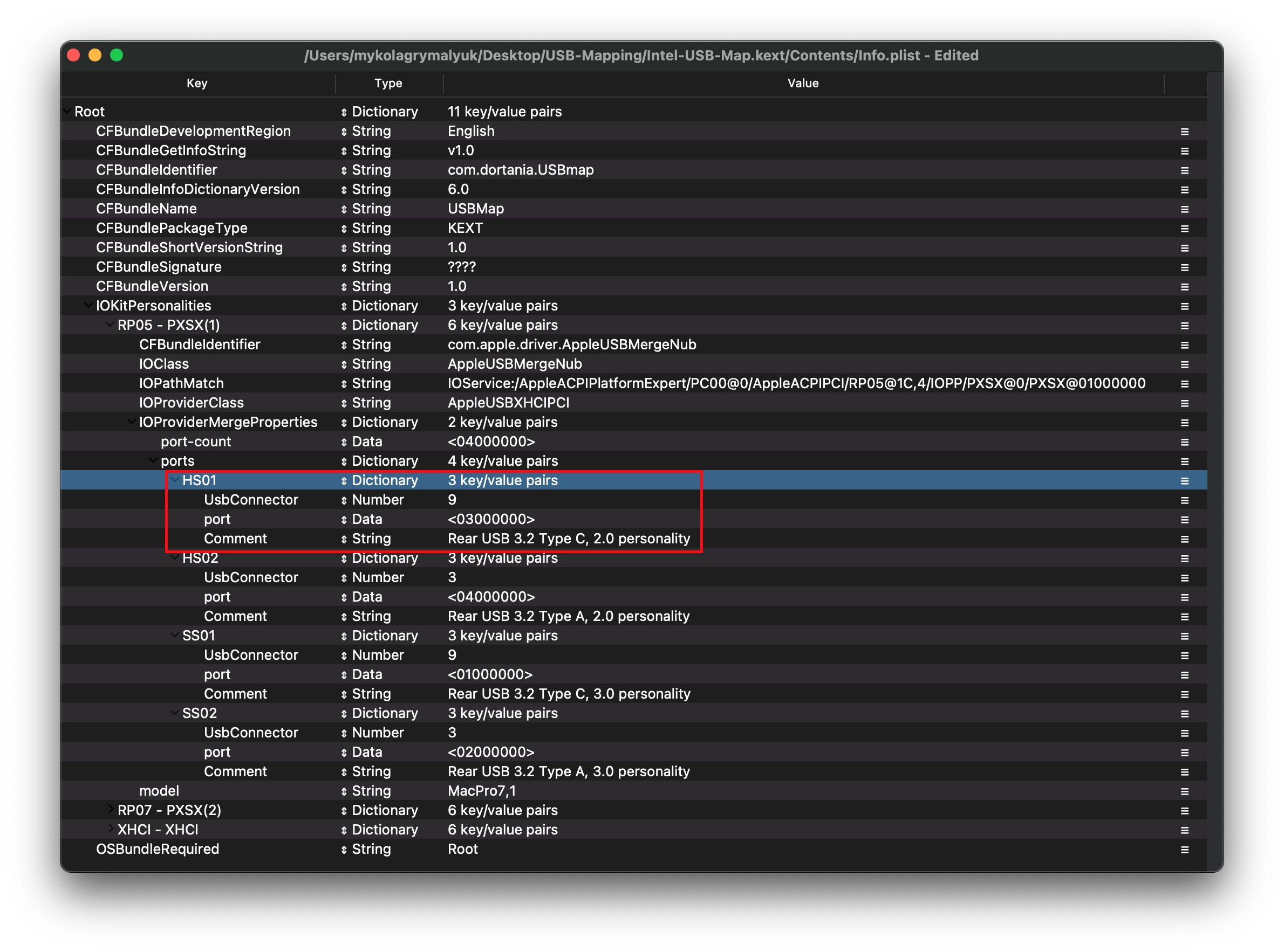 Lưu ý: Nếu cổng USB của bạn hiện lên là AppleUSB20XHCIPort hoặc AppleUSB30XHCIPort, bạn vẫn có thể map nhưng sẽ khó hơn chút. Thay vì ghi lại tên, hãy chú ý thật kỹ vào thuộc tính port ở phía bên phải: