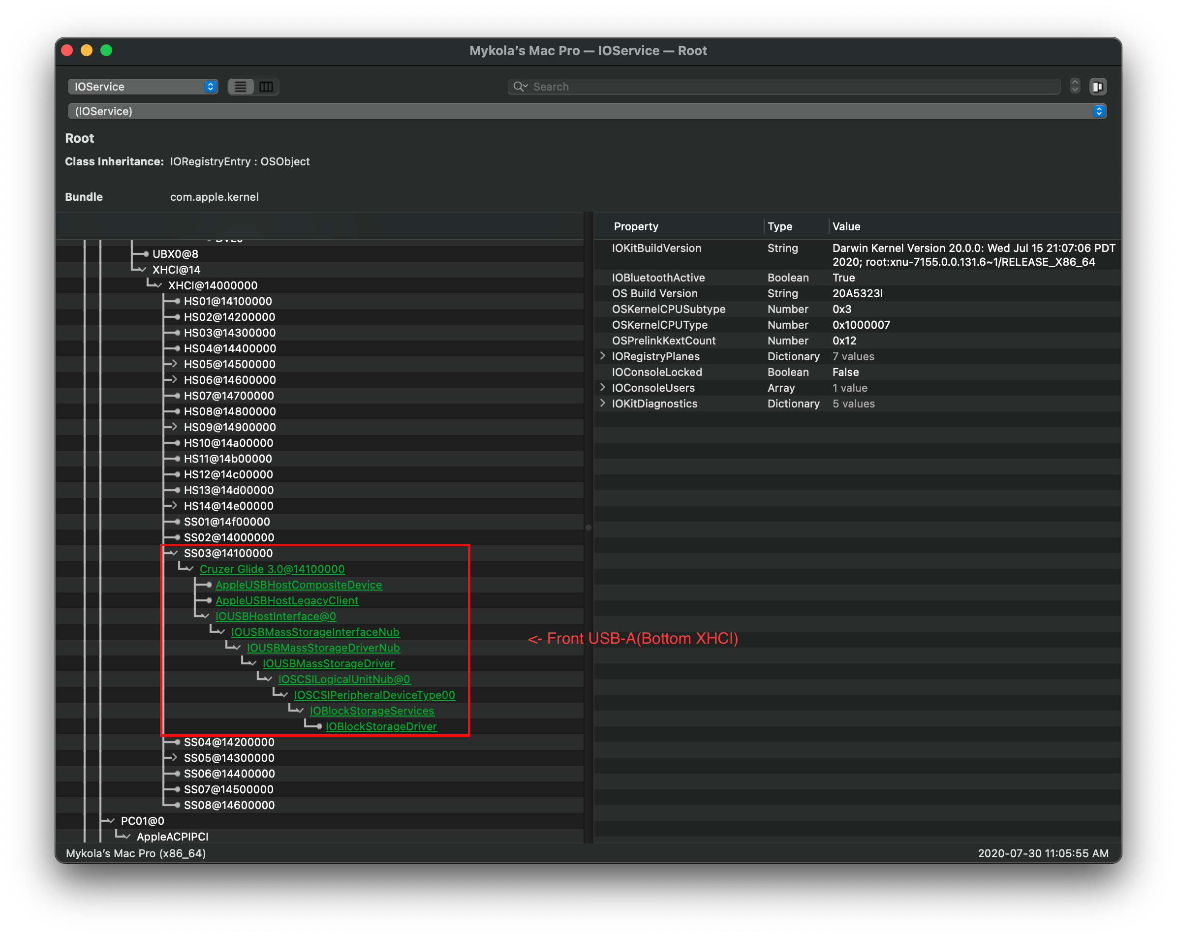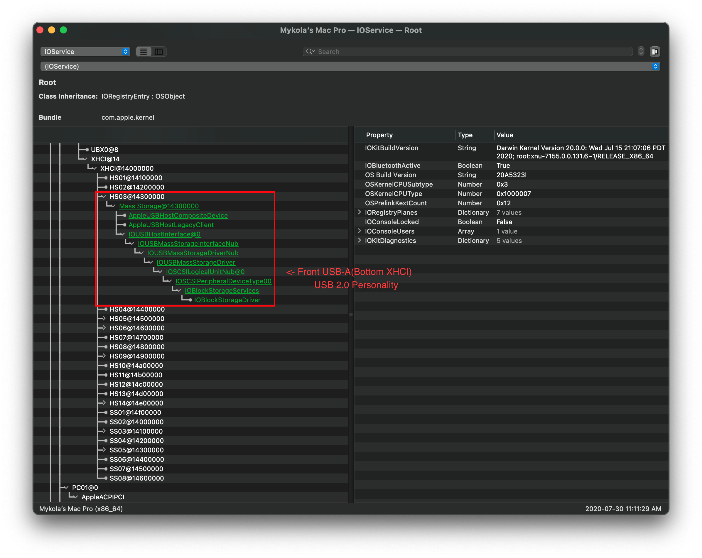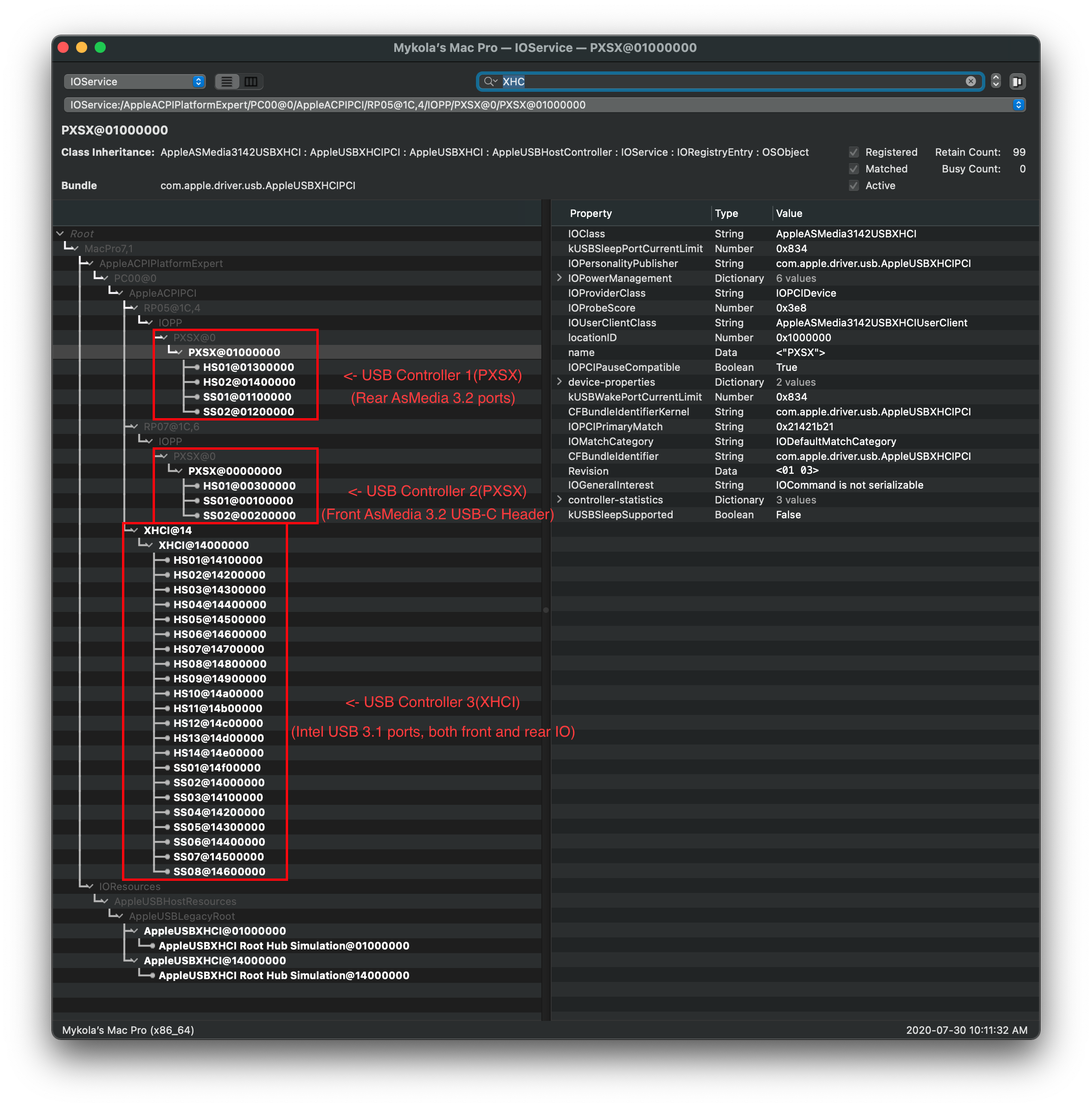 Mở cái IORegistryExplorer.app (opens new window) đã tải lúc nãy lên và tìm (các) bộ điều khiển USB của bạn.