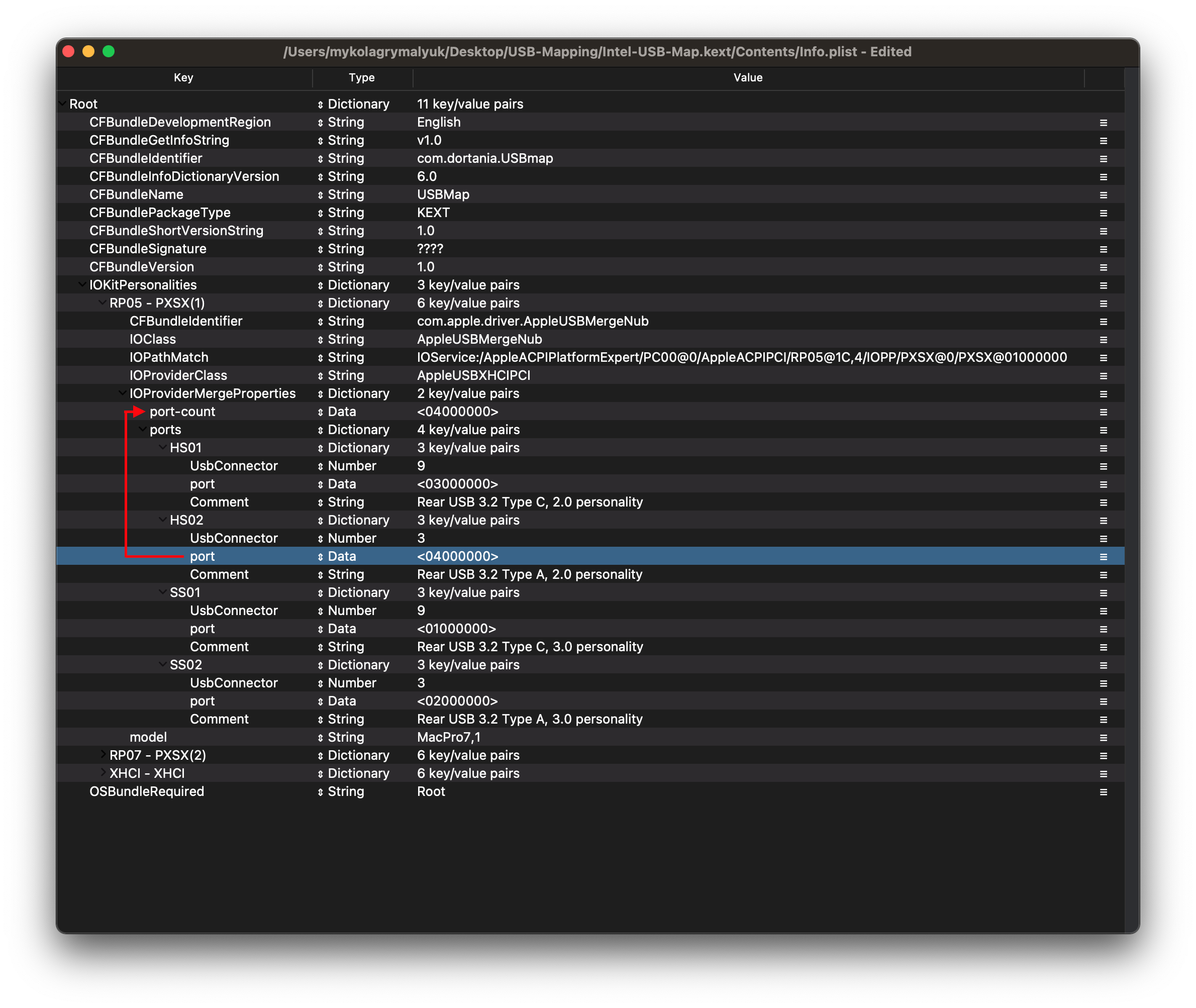 Để tìm giá trị port, đơn giản chọn cổng USB của bạn trong IOReg và tìm mục port: