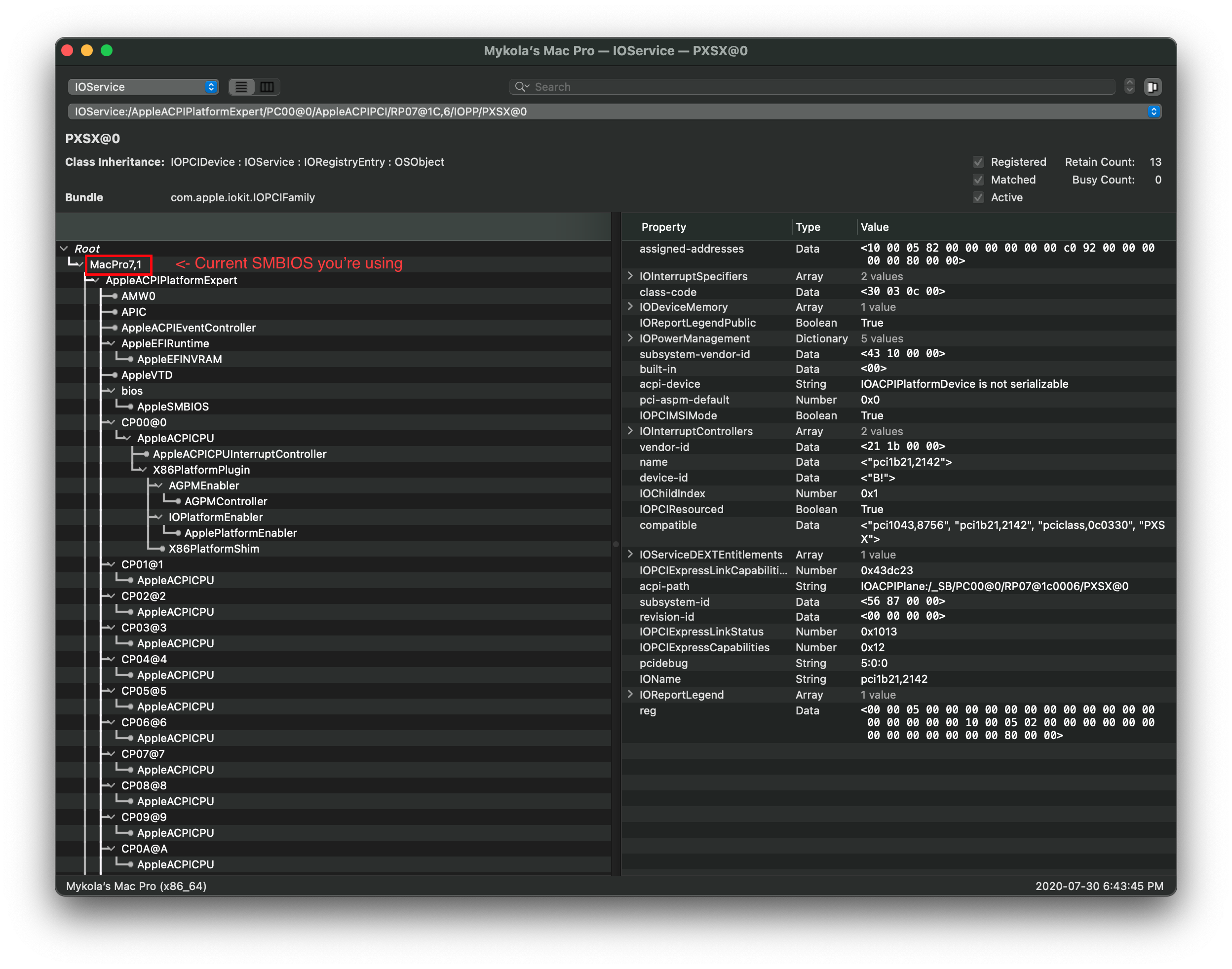 Nếu bạn quên mình đang dùng SMBIOS nào, chỉ cần kiểm tra thiết bị ở cấp cao nhất trong IOReg: