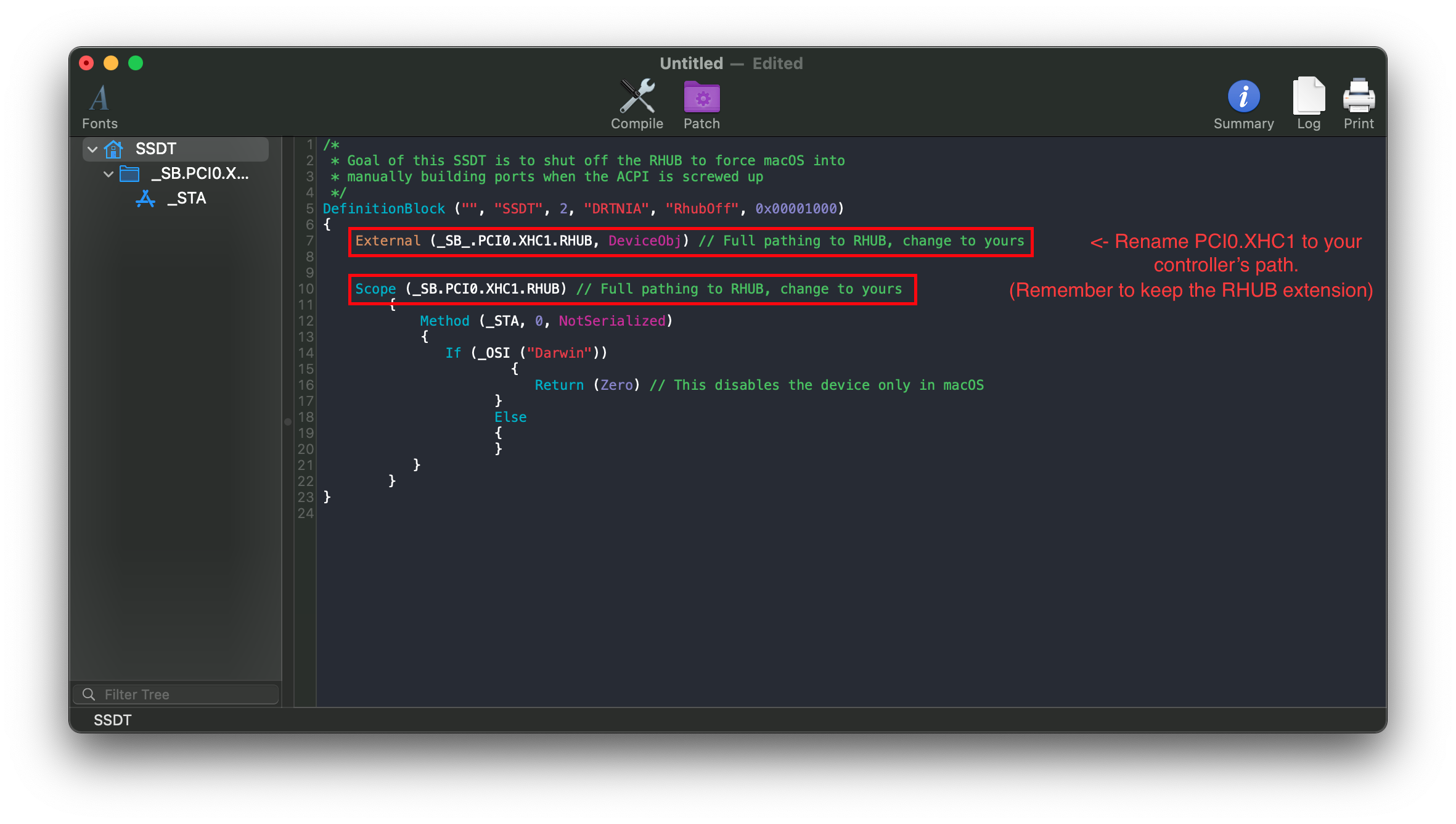 Theo ví dụ trên, chúng ta sẽ đổi tên PCI0.XHC1.RHUB thành PC00.RP05.PXSX.RHUB: