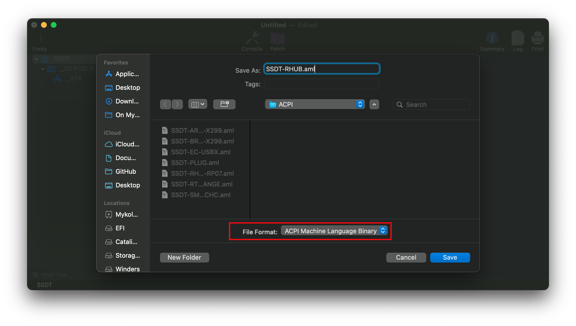 Khi đã sửa xong SSDT theo đường dẫn bộ điều khiển USB của bạn, bạn có thể xuất nó ra bằng File -> Save As -> ACPI Machine Language Binary: