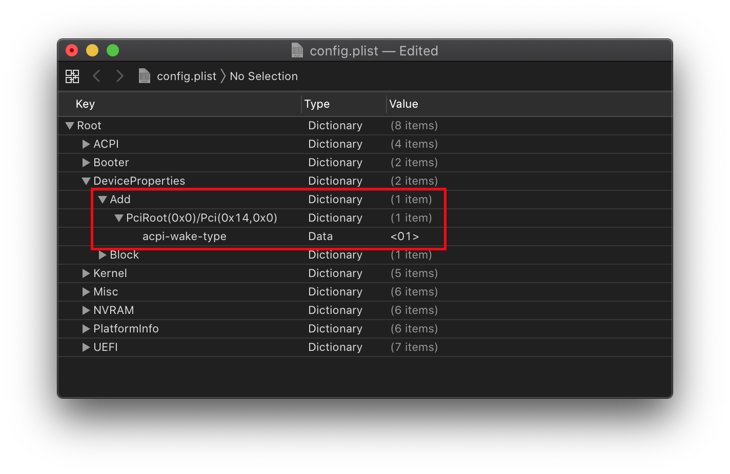Cách lý tưởng nhất là tuyên bố với hệ thống rằng XHCI Controller (chính là Bộ điều khiển USB của chúng ta) là một thiết bị đánh thức ACPI, vì chúng ta không có EC (Embedded Controller) tương thích để macOS xử lý các lệnh gọi đánh thức một cách chuẩn chỉ.