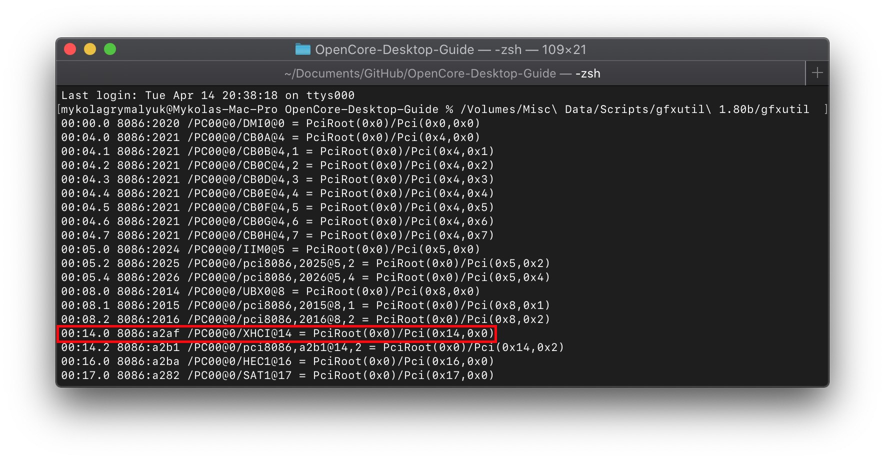 Để bắt đầu, chúng ta cần tóm lấy cái PciRoot của Bộ điều khiển USB (chúng ta sẽ dùng gfxutil (opens new window), thường thì tên sẽ là XHC, XHC1 và XHCI)